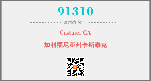 上述内容是“Castaic, CA”作为“91310”的缩写,解释为“加利福尼亚州卡斯泰克”时的信息,以及英文缩略词91310所代表的英文单词,其对应的中文拼音、详细解释以及在英文中的流行度和相关分类、应用领域及应用示例等。