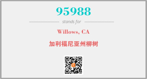 上述内容是“Willows, CA”作为“95988”的缩写,解释为“加利福尼亚州柳树”时的信息,以及英文缩略词95988所代表的英文单词,其对应的中文拼音、详细解释以及在英文中的流行度和相关分类、应用领域及应用示例等。