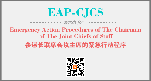 英文缩略词“EAP-CJCS”经常作为“Emergency Action Procedures of The Chairman of The Joint Chiefs of Staff”的英文缩写来使用,中文表示:“参谋长联席会议主席的紧急行动程序”。本文将详细介绍英文缩写词EAP-CJCS所代表英文单词,其对应的中文拼音、详细解释以及在英语中的流行度。此外,还有关于缩略词EAP-CJCS的分类、应用领域及相关应用示例等。