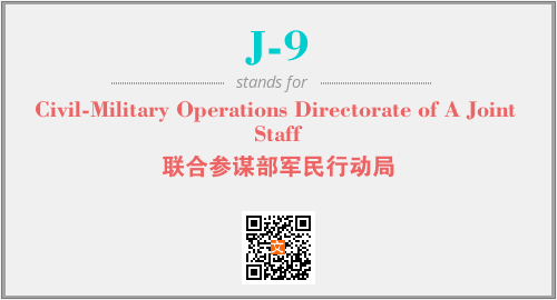 英文缩略词“J-9”经常作为“Civil-Military Operations Directorate of A Joint Staff”的英文缩写来使用,中文表示:“联合参谋部军民行动局”。本文将详细介绍英文缩写词J-9所代表英文单词,其对应的中文拼音、详细解释以及在英语中的流行度。此外,还有关于缩略词J-9的分类、应用领域及相关应用示例等。