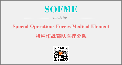 上述内容是“Special Operations Forces Medical Element”作为“SOFME”的缩写,解释为“特种作战部队医疗分队”时的信息,以及英文缩略词SOFME所代表的英文单词,其对应的中文拼音、详细解释以及在英文中的流行度和相关分类、应用领域及应用示例等。
