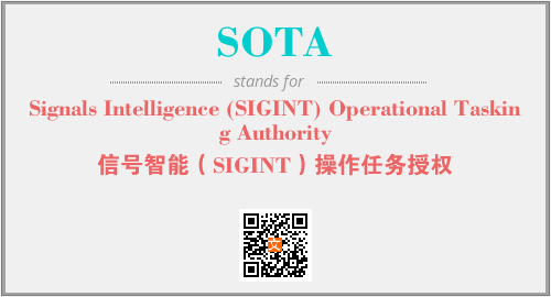 上述内容是“Signals Intelligence (SIGINT) Operational Tasking Authority”作为“SOTA”的缩写,解释为“信号智能(SIGINT)操作任务授权”时的信息,以及英文缩略词SOTA所代表的英文单词,其对应的中文拼音、详细解释以及在英文中的流行度和相关分类、应用领域及应用示例等。