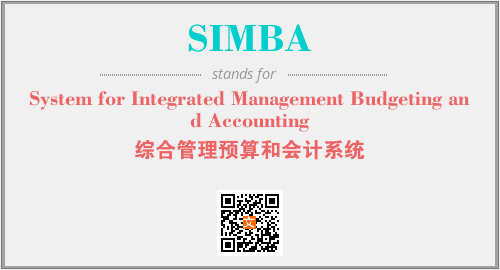上述内容是“System for Integrated Management Budgeting and Accounting”作为“SIMBA”的缩写,解释为“综合管理预算和会计系统”时的信息,以及英文缩略词SIMBA所代表的英文单词,其对应的中文拼音、详细解释以及在英文中的流行度和相关分类、应用领域及应用示例等。