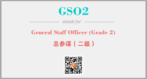 上述内容是“General Staff Officer (Grade 2)”作为“GSO2”的缩写,解释为“总参谋(二级)”时的信息,以及英文缩略词GSO2所代表的英文单词,其对应的中文拼音、详细解释以及在英文中的流行度和相关分类、应用领域及应用示例等。