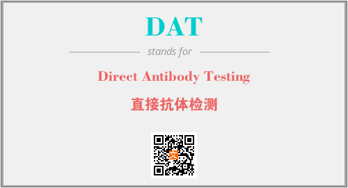 上述内容是“Direct Antibody Testing”作为“DAT”的缩写,解释为“直接抗体检测”时的信息,以及英文缩略词DAT所代表的英文单词,其对应的中文拼音、详细解释以及在英文中的流行度和相关分类、应用领域及应用示例等。