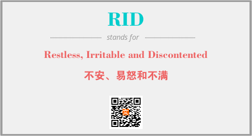 上述内容是“Restless, Irritable and Discontented”作为“RID”的缩写,解释为“不安、易怒和不满”时的信息,以及英文缩略词RID所代表的英文单词,其对应的中文拼音、详细解释以及在英文中的流行度和相关分类、应用领域及应用示例等。
