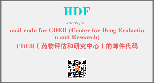 上述内容是“mail code for CDER (Center for Drug Evaluation and Research)”作为“HDF”的缩写,解释为“CDER(药物评估和研究中心)的邮件代码”时的信息,以及英文缩略词HDF所代表的英文单词,其对应的中文拼音、详细解释以及在英文中的流行度和相关分类、应用领域及应用示例等。