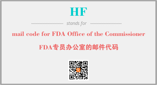 上述内容是“mail code for FDA Office of the Commissioner”作为“HF”的缩写,解释为“FDA专员办公室的邮件代码”时的信息,以及英文缩略词HF所代表的英文单词,其对应的中文拼音、详细解释以及在英文中的流行度和相关分类、应用领域及应用示例等。