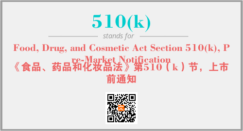 英文缩略词“510(k)”经常作为“Food, Drug, and Cosmetic Act Section 510(k), Pre-Market Notification”的英文缩写来使用,中文表示:“《食品、药品和化妆品法》第510(k)节,上市前通知”。本文将详细介绍英文缩写词510(k)所代表英文单词,其对应的中文拼音、详细解释以及在英语中的流行度。此外,还有关于缩略词510(k)的分类、应用领域及相关应用示例等。