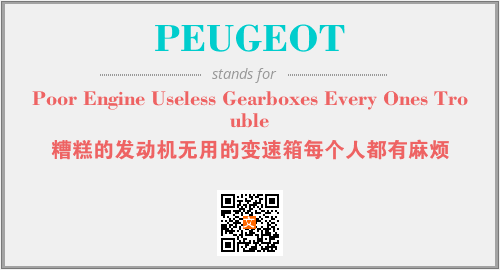 以上为Poor Engine Useless Gearboxes Every Ones Trouble英文缩略词PEUGEOT的中文解释,以及该英文缩写在英语的流行度、分类和应用领域方面的信息。