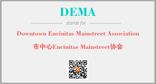 英文缩略词“DEMA”经常作为“Downtown Encinitas Mainstreet Association”的英文缩写来使用,中文表示:“市中心Encinitas Mainstreet协会”。本文将详细介绍英文缩写词DEMA所代表英文单词,其对应的中文拼音、详细解释以及在英语中的流行度。此外,还有关于缩略词DEMA的分类、应用领域及相关应用示例等。