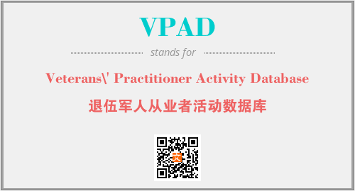 上述内容是“Veterans\' Practitioner Activity Database”作为“VPAD”的缩写,解释为“退伍军人从业者活动数据库”时的信息,以及英文缩略词VPAD所代表的英文单词,其对应的中文拼音、详细解释以及在英文中的流行度和相关分类、应用领域及应用示例等。