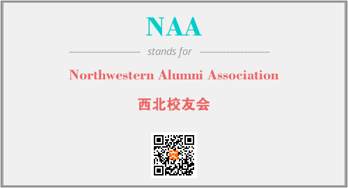上述内容是“Northwestern Alumni Association”作为“NAA”的缩写,解释为“西北校友会”时的信息,以及英文缩略词NAA所代表的英文单词,其对应的中文拼音、详细解释以及在英文中的流行度和相关分类、应用领域及应用示例等。