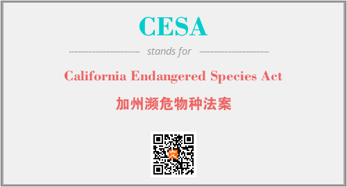 上述内容是“California Endangered Species Act”作为“CESA”的缩写,解释为“加州濒危物种法案”时的信息,以及英文缩略词CESA所代表的英文单词,其对应的中文拼音、详细解释以及在英文中的流行度和相关分类、应用领域及应用示例等。