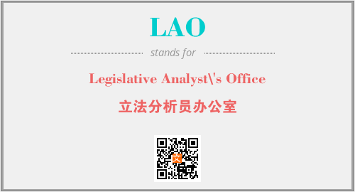 英文缩略词“LAO”经常作为“Legislative Analyst\'s Office”的英文缩写来使用,中文表示:“立法分析员办公室”。本文将详细介绍英文缩写词LAO所代表英文单词,其对应的中文拼音、详细解释以及在英语中的流行度。此外,还有关于缩略词LAO的分类、应用领域及相关应用示例等。