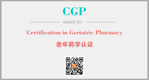 上述内容是“Certification in Geriatric Pharmacy”作为“CGP”的缩写,解释为“老年药学认证”时的信息,以及英文缩略词CGP所代表的英文单词,其对应的中文拼音、详细解释以及在英文中的流行度和相关分类、应用领域及应用示例等。