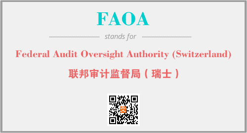 上述内容是“Federal Audit Oversight Authority (Switzerland)”作为“FAOA”的缩写,解释为“联邦审计监督局(瑞士)”时的信息,以及英文缩略词FAOA所代表的英文单词,其对应的中文拼音、详细解释以及在英文中的流行度和相关分类、应用领域及应用示例等。