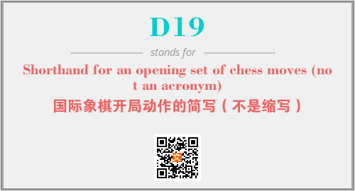 以上为Shorthand for an opening set of chess moves (not an acronym)英文缩略词D19的中文解释,以及该英文缩写在英语的流行度、分类和应用领域方面的信息。