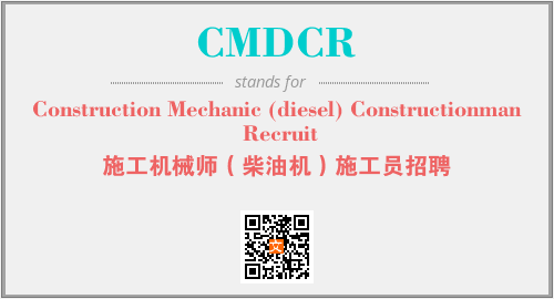 英文缩略词“CMDCR”经常作为“Construction Mechanic (diesel) Constructionman Recruit”的英文缩写来使用,中文表示:“施工机械师(柴油机)施工员招聘”。本文将详细介绍英文缩写词CMDCR所代表英文单词,其对应的中文拼音、详细解释以及在英语中的流行度。此外,还有关于缩略词CMDCR的分类、应用领域及相关应用示例等。