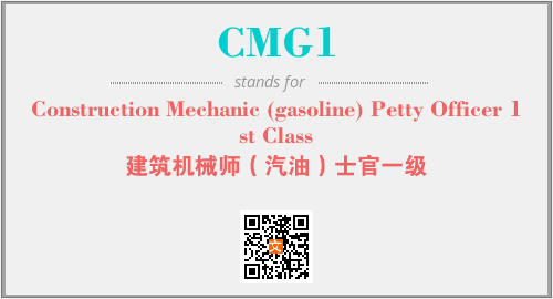 英文缩略词“CMG1”经常作为“Construction Mechanic (gasoline) Petty Officer 1st Class”的英文缩写来使用,中文表示:“建筑机械师(汽油)士官一级”。本文将详细介绍英文缩写词CMG1所代表英文单词,其对应的中文拼音、详细解释以及在英语中的流行度。此外,还有关于缩略词CMG1的分类、应用领域及相关应用示例等。