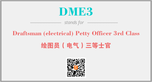 上述内容是“Draftsman (electrical) Petty Officer 3rd Class”作为“DME3”的缩写,解释为“绘图员(电气)三等士官”时的信息,以及英文缩略词DME3所代表的英文单词,其对应的中文拼音、详细解释以及在英文中的流行度和相关分类、应用领域及应用示例等。