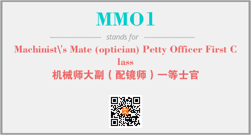 英文缩略词“MMO1”经常作为“Machinist\'s Mate (optician) Petty Officer First Class”的英文缩写来使用,中文表示:“机械师大副(配镜师)一等士官”。本文将详细介绍英文缩写词MMO1所代表英文单词,其对应的中文拼音、详细解释以及在英语中的流行度。此外,还有关于缩略词MMO1的分类、应用领域及相关应用示例等。