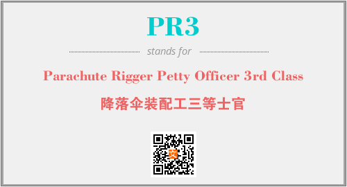 上述内容是“Parachute Rigger Petty Officer 3rd Class”作为“PR3”的缩写,解释为“降落伞装配工三等士官”时的信息,以及英文缩略词PR3所代表的英文单词,其对应的中文拼音、详细解释以及在英文中的流行度和相关分类、应用领域及应用示例等。