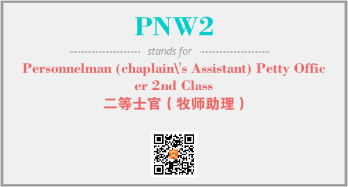 上述内容是“Personnelman (chaplain\'s Assistant) Petty Officer 2nd Class”作为“PNW2”的缩写,解释为“二等士官(牧师助理)”时的信息,以及英文缩略词PNW2所代表的英文单词,其对应的中文拼音、详细解释以及在英文中的流行度和相关分类、应用领域及应用示例等。