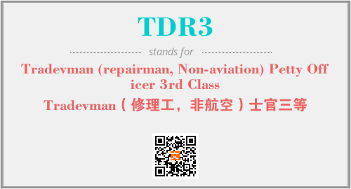 上述内容是“Tradevman (repairman, Non-aviation) Petty Officer 3rd Class”作为“TDR3”的缩写,解释为“Tradevman(修理工,非航空)士官三等”时的信息,以及英文缩略词TDR3所代表的英文单词,其对应的中文拼音、详细解释以及在英文中的流行度和相关分类、应用领域及应用示例等。