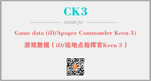 上述内容是“Game data (iD/Apogee Commander Keen 3)”作为“CK3”的缩写,解释为“游戏数据(iD/远地点指挥官Keen 3)”时的信息,以及英文缩略词CK3所代表的英文单词,其对应的中文拼音、详细解释以及在英文中的流行度和相关分类、应用领域及应用示例等。