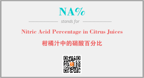 上述内容是“Nitric Acid Percentage in Citrus Juices”作为“NA%”的缩写,解释为“柑橘汁中的硝酸百分比”时的信息,以及英文缩略词NA%所代表的英文单词,其对应的中文拼音、详细解释以及在英文中的流行度和相关分类、应用领域及应用示例等。