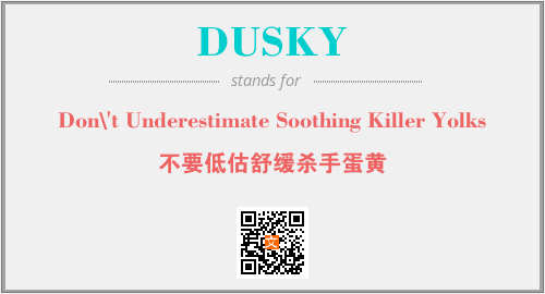 上述内容是“Don\'t Underestimate Soothing Killer Yolks”作为“DUSKY”的缩写,解释为“不要低估舒缓杀手蛋黄”时的信息,以及英文缩略词DUSKY所代表的英文单词,其对应的中文拼音、详细解释以及在英文中的流行度和相关分类、应用领域及应用示例等。