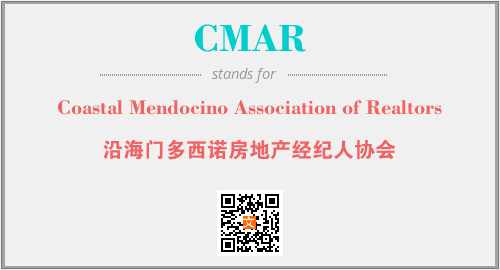 上述内容是“Coastal Mendocino Association of Realtors”作为“CMAR”的缩写,解释为“沿海门多西诺房地产经纪人协会”时的信息,以及英文缩略词CMAR所代表的英文单词,其对应的中文拼音、详细解释以及在英文中的流行度和相关分类、应用领域及应用示例等。