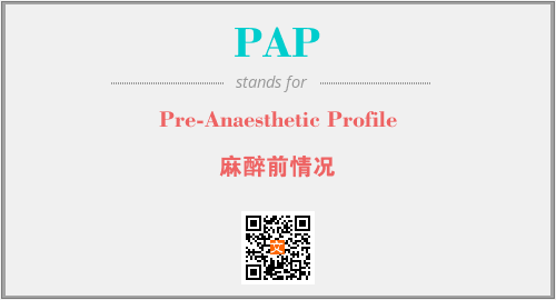 英文缩略词“PAP”经常作为“Pre-Anaesthetic Profile”的英文缩写来使用,中文表示:“麻醉前情况”。本文将详细介绍英文缩写词PAP所代表英文单词,其对应的中文拼音、详细解释以及在英语中的流行度。此外,还有关于缩略词PAP的分类、应用领域及相关应用示例等。