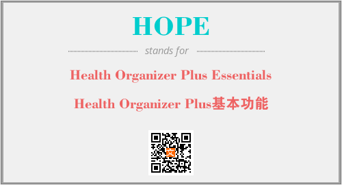 上述内容是“Health Organizer Plus Essentials”作为“HOPE”的缩写,解释为“Health Organizer Plus基本功能”时的信息,以及英文缩略词HOPE所代表的英文单词,其对应的中文拼音、详细解释以及在英文中的流行度和相关分类、应用领域及应用示例等。