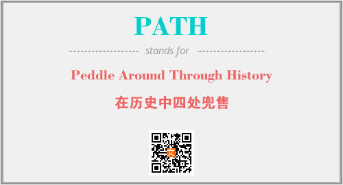 上述内容是“Peddle Around Through History”作为“PATH”的缩写,解释为“在历史中四处兜售”时的信息,以及英文缩略词PATH所代表的英文单词,其对应的中文拼音、详细解释以及在英文中的流行度和相关分类、应用领域及应用示例等。