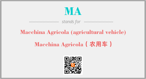 英文缩略词“MA”经常作为“Macchina Agricola (agricultural vehicle)”的英文缩写来使用,中文表示:“Macchina Agricola(农用车)”。本文将详细介绍英文缩写词MA所代表英文单词,其对应的中文拼音、详细解释以及在英语中的流行度。此外,还有关于缩略词MA的分类、应用领域及相关应用示例等。