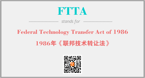 上述内容是“Federal Technology Transfer Act of 1986”作为“FTTA”的缩写,解释为“1986年《联邦技术转让法》”时的信息,以及英文缩略词FTTA所代表的英文单词,其对应的中文拼音、详细解释以及在英文中的流行度和相关分类、应用领域及应用示例等。