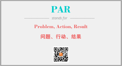 上述内容是“Problem, Action, Result”作为“PAR”的缩写,解释为“问题、行动、结果”时的信息,以及英文缩略词PAR所代表的英文单词,其对应的中文拼音、详细解释以及在英文中的流行度和相关分类、应用领域及应用示例等。