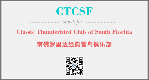 上述内容是“Classic Thunderbird Club of South Florida”作为“CTCSF”的缩写,解释为“南佛罗里达经典雷鸟俱乐部”时的信息,以及英文缩略词CTCSF所代表的英文单词,其对应的中文拼音、详细解释以及在英文中的流行度和相关分类、应用领域及应用示例等。