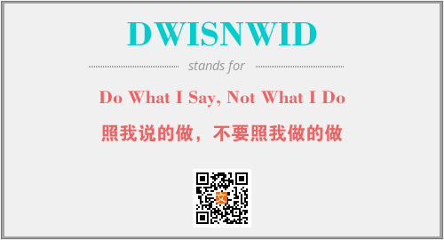 上述内容是“Do What I Say, Not What I Do”作为“DWISNWID”的缩写,解释为“照我说的做,不要照我做的做”时的信息,以及英文缩略词DWISNWID所代表的英文单词,其对应的中文拼音、详细解释以及在英文中的流行度和相关分类、应用领域及应用示例等。