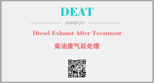 上述内容是“Diesel Exhaust After Treatment”作为“DEAT”的缩写,解释为“柴油废气后处理”时的信息,以及英文缩略词DEAT所代表的英文单词,其对应的中文拼音、详细解释以及在英文中的流行度和相关分类、应用领域及应用示例等。