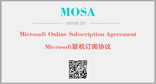 英文缩略词“MOSA”经常作为“Microsoft Online Subscription Agreement”的英文缩写来使用,中文表示:“Microsoft联机订阅协议”。本文将详细介绍英文缩写词MOSA所代表英文单词,其对应的中文拼音、详细解释以及在英语中的流行度。此外,还有关于缩略词MOSA的分类、应用领域及相关应用示例等。