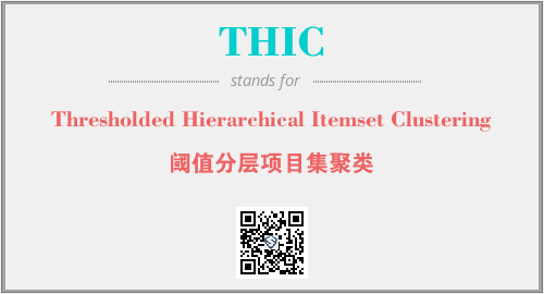 上述内容是“Thresholded Hierarchical Itemset Clustering”作为“THIC”的缩写,解释为“阈值分层项目集聚类”时的信息,以及英文缩略词THIC所代表的英文单词,其对应的中文拼音、详细解释以及在英文中的流行度和相关分类、应用领域及应用示例等。