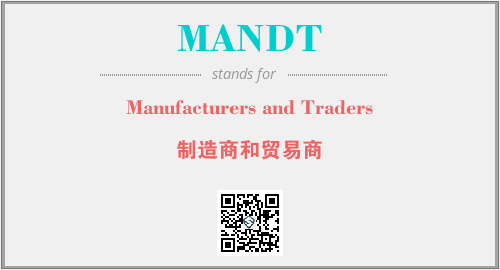 英文缩略词“MANDT”经常作为“Manufacturers and Traders”的英文缩写来使用,中文表示:“制造商和贸易商”。本文将详细介绍英文缩写词MANDT所代表英文单词,其对应的中文拼音、详细解释以及在英语中的流行度。此外,还有关于缩略词MANDT的分类、应用领域及相关应用示例等。
