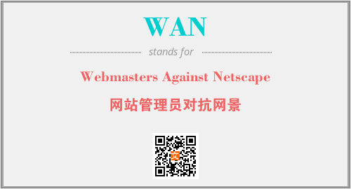 上述内容是“Webmasters Against Netscape”作为“WAN”的缩写,解释为“网站管理员对抗网景”时的信息,以及英文缩略词WAN所代表的英文单词,其对应的中文拼音、详细解释以及在英文中的流行度和相关分类、应用领域及应用示例等。