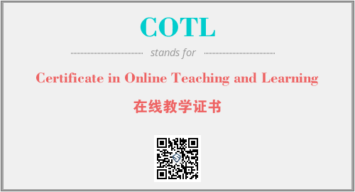英文缩略词“COTL”经常作为“Certificate in Online Teaching and Learning”的英文缩写来使用,中文表示:“在线教学证书”。本文将详细介绍英文缩写词COTL所代表英文单词,其对应的中文拼音、详细解释以及在英语中的流行度。此外,还有关于缩略词COTL的分类、应用领域及相关应用示例等。