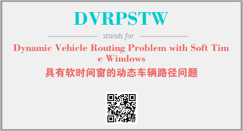 上述内容是“Dynamic Vehicle Routing Problem with Soft Time Windows”作为“DVRPSTW”的缩写,解释为“具有软时间窗的动态车辆路径问题”时的信息,以及英文缩略词DVRPSTW所代表的英文单词,其对应的中文拼音、详细解释以及在英文中的流行度和相关分类、应用领域及应用示例等。