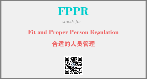 上述内容是“Fit and Proper Person Regulation”作为“FPPR”的缩写,解释为“合适的人员管理”时的信息,以及英文缩略词FPPR所代表的英文单词,其对应的中文拼音、详细解释以及在英文中的流行度和相关分类、应用领域及应用示例等。