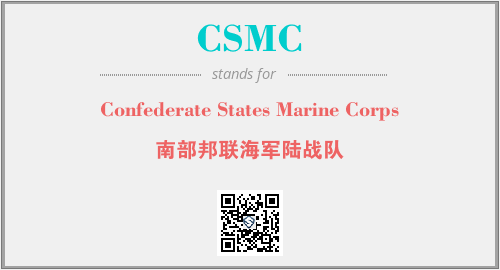 上述内容是“Confederate States Marine Corps”作为“CSMC”的缩写,解释为“南部邦联海军陆战队”时的信息,以及英文缩略词CSMC所代表的英文单词,其对应的中文拼音、详细解释以及在英文中的流行度和相关分类、应用领域及应用示例等。